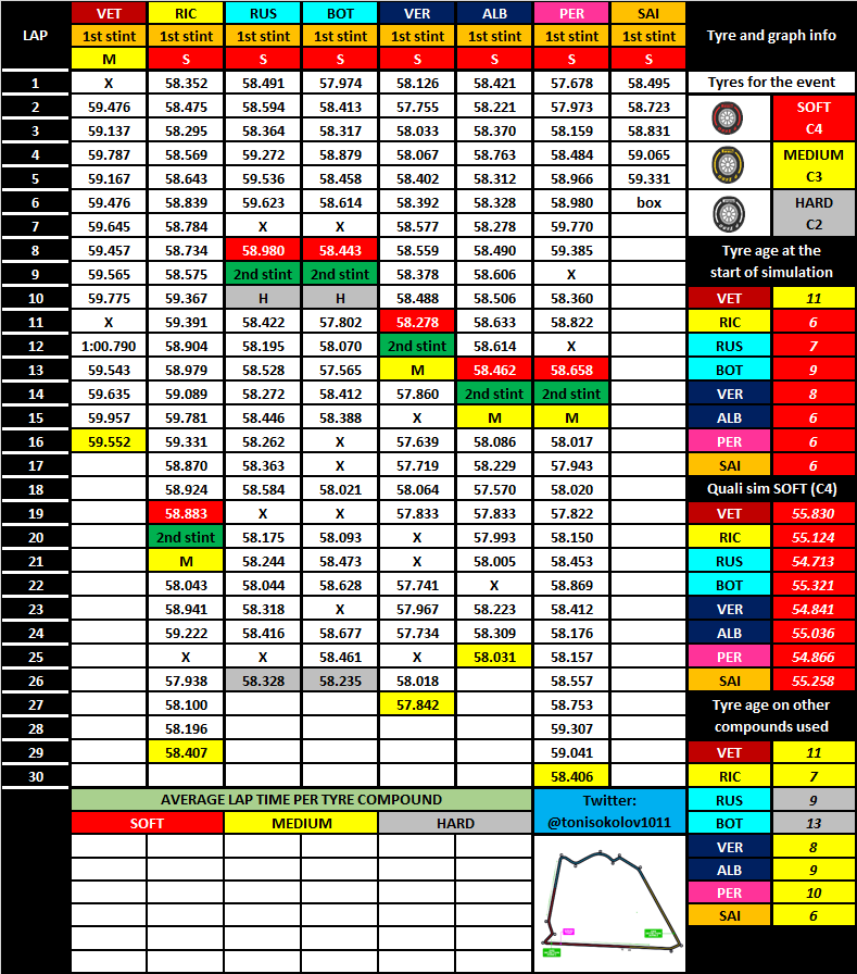 Maar aan de andere kant, je moet gewoon je snelle tijd rijden op een legere baan. Allemaal tegelijk helpt gewoon niet. Ik verwacht dat Q1 dan ook wel wat chaos wordt en niemand echt zijn tijd verbeterd (want degene die zijn ronde start komt nog aan het eind langs de mensen die zich nog klaarmaken voor hun ronde). Q2 zal ook nog wel een beetje drama zijn. Q3 lijkt me gewoon prima.