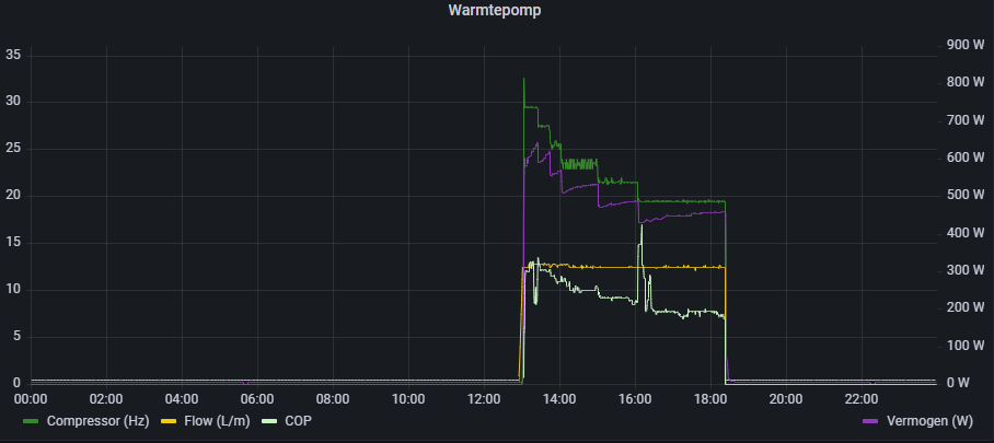 Ik heb sinds een maandje de TCAP 12kW j-serie. Het minimum opgenomen vermogen is bij 19 Hz ca 800-1000 Watt. COP is ca 6. Daar kan ik bij deze temperaturen ook goed mee uit de voeten (grafiek van gistermiddag/avond).