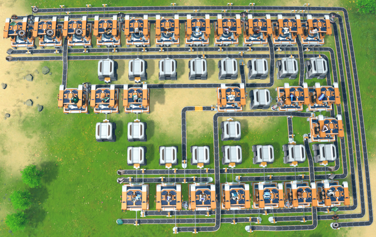 Op gegeven moment switch ik naar Interplanetary towers voor zowel aanvoer van materialen als opslag/afvoer van geproduceerde gebouwen. Uiteindelijk heb je honderd(en) Assemblers of chemical plants nodig voor een build, dat trekt een bus systeem niet meer