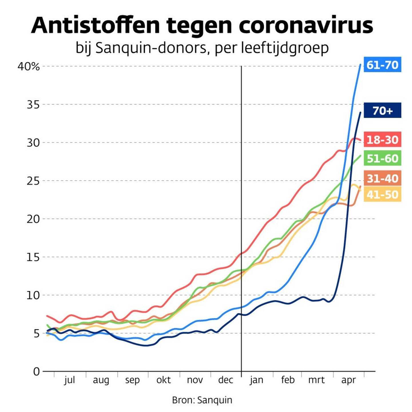 De anti stoffen testen van de bloedbank laten een goede toename zien, gestuwd door alle vaccinaties onder de ouderen:
