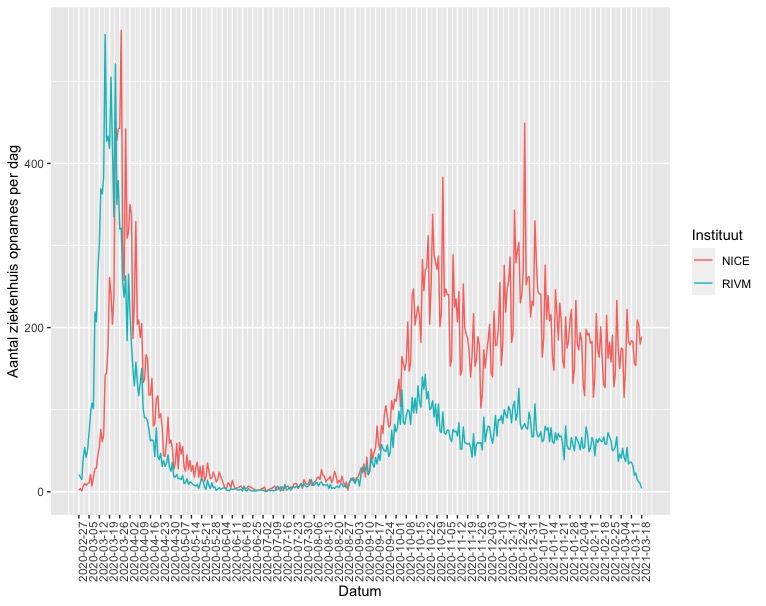 https://coronadashboard.rijksoverheid.nl/verantwoordingVoorheen gebruikte het dashboard cijfers uit de Osiris database. De gegevens in Osiris zijn voornamelijk afkomstig van de GGD’en. Osiris kent inmiddels echter een aanzienlijke onderrapportage van ziekenhuisopnames doordat de GGD’en niet altijd meer informatie krijgen over ziekenhuisopnames van Covid-patiënten. Het bestand van NICE is completer, maar hanteert ook een ruimere definitie van ziekenhuisopname. Osiris neemt alleen de patiënten mee die vanwege COVID-19 in het ziekenhuis liggen, terwijl NICE ook ziekenhuisopnames rapporteert van patiënten met COVID-19, maar die om een andere reden in het ziekenhuis zijn opgenomen.