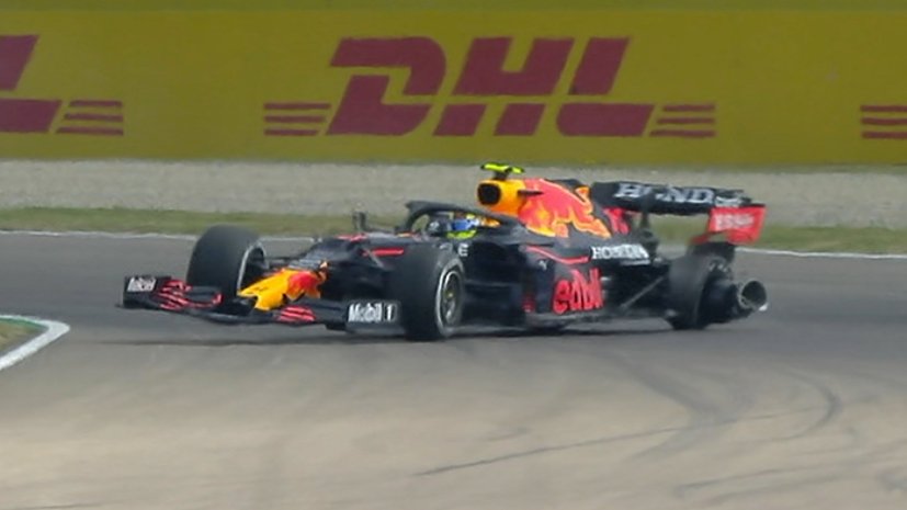 Here's the damage to Perez's Red Bull. Ocon comes around the corner moments later and stops with apparent damage. So... we just have to guess what happens with no onboard cameras working 😅 #ImolaGP pic.twitter.com/XfBeFUSjLc