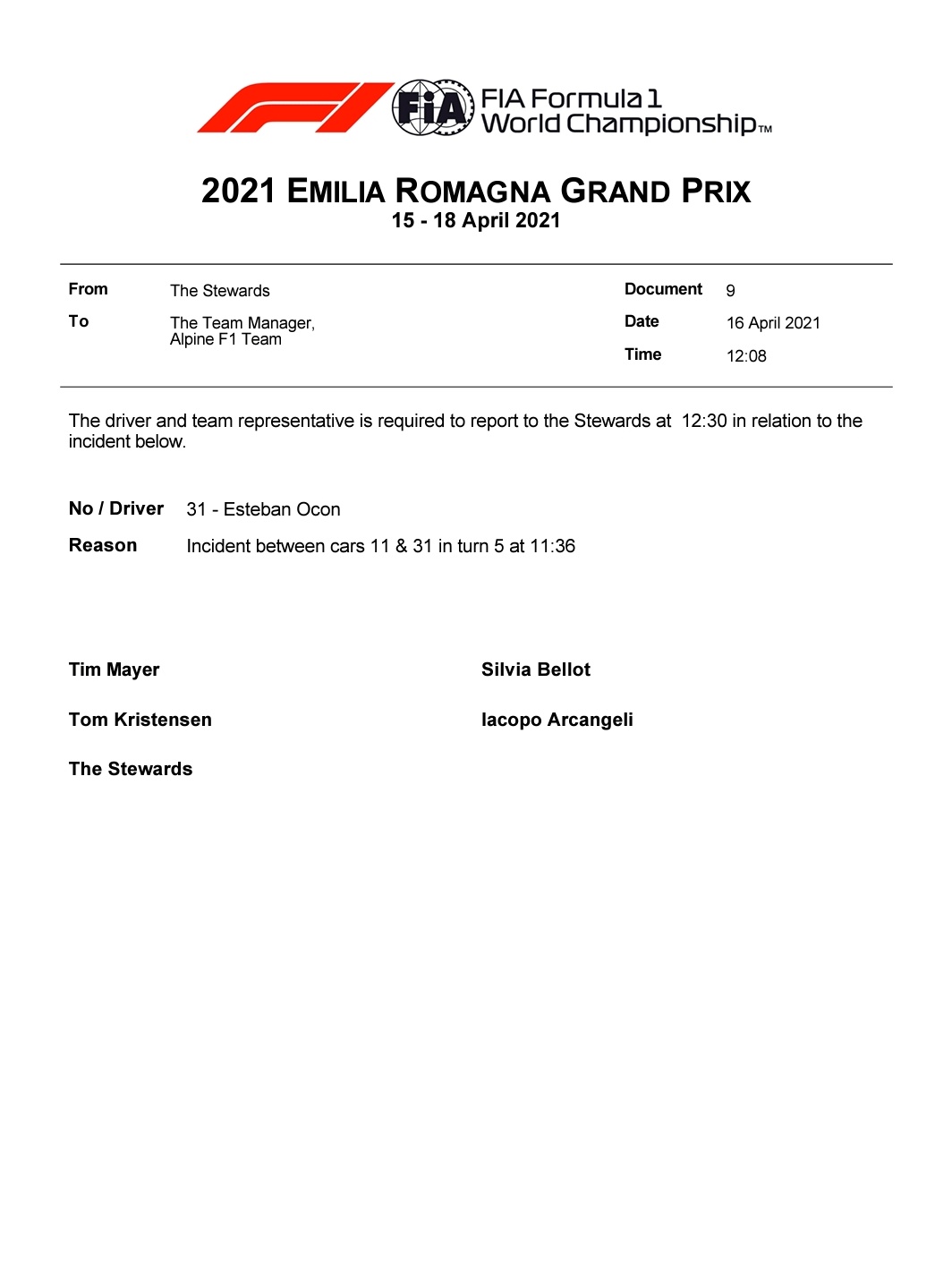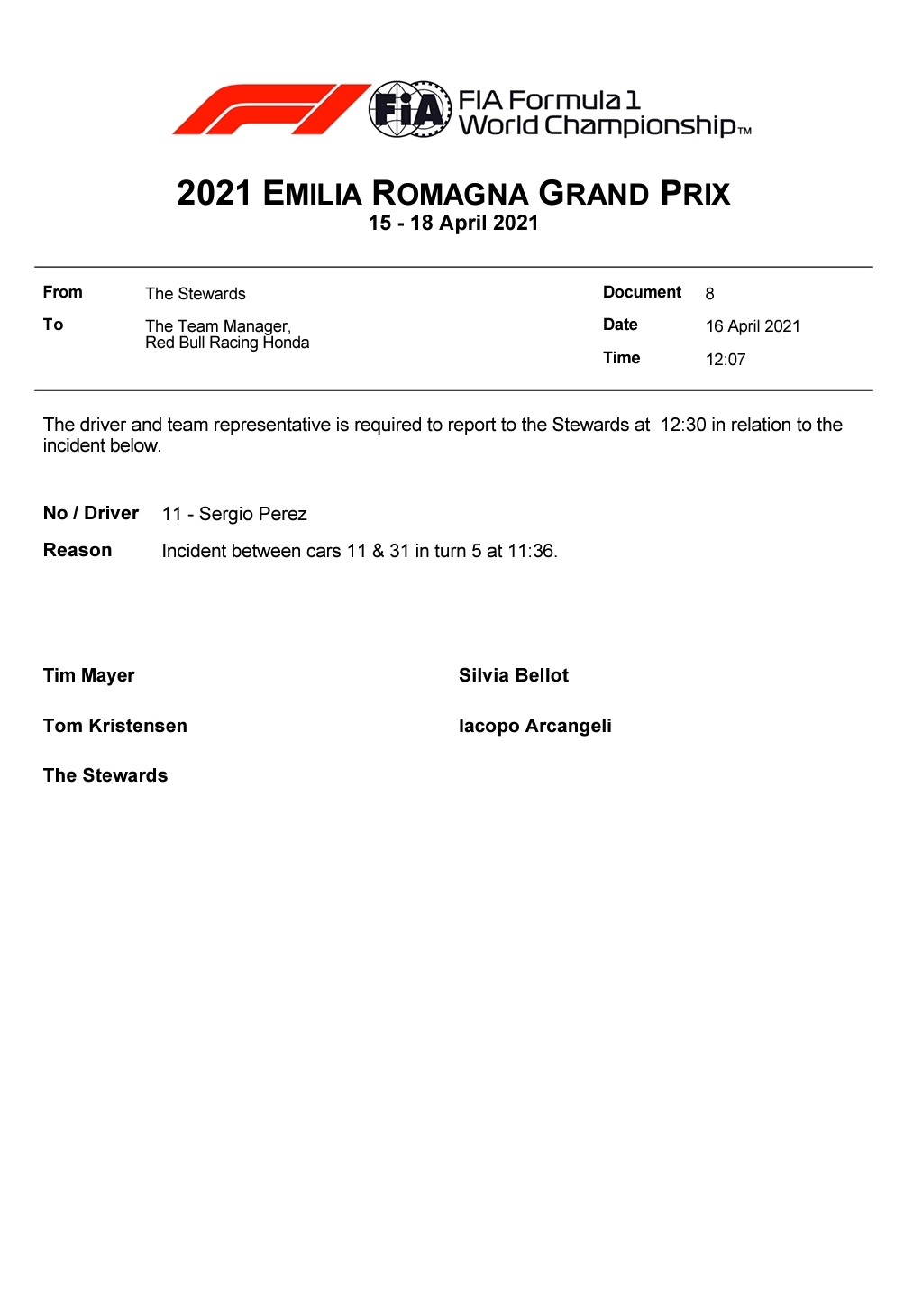 1. No action from the stewards on the OCO/PER clash in FP1: "Ocon slowed before Turn 5 in order to let Perez by, as well as moving entirely to the inside of the turn. Perez was on a fast lap. The two cars reached the apex at the same time, and just barely touched wheels."