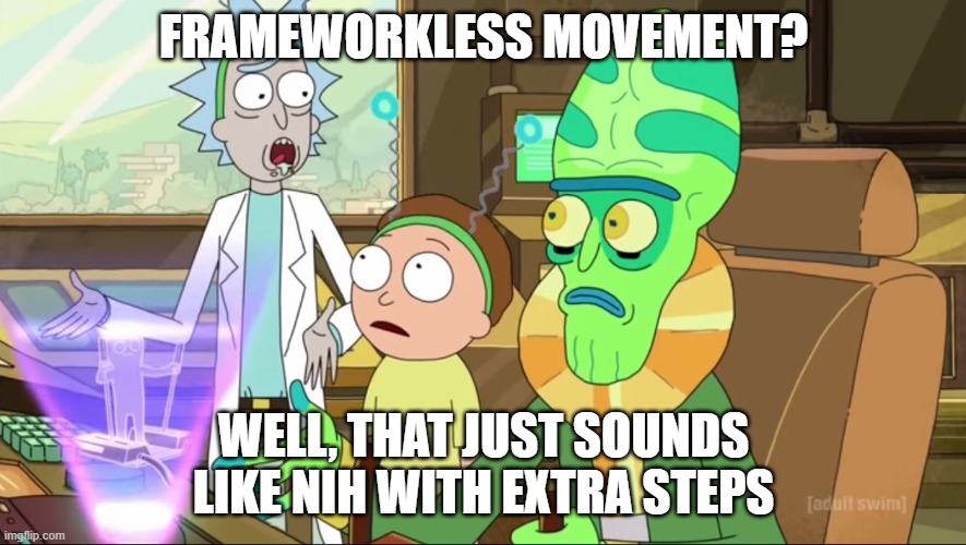 Dit allemaal zelf willen doen omdat je denkt dat je het beter kan heeft een naam; Not invented here. 9 van de 10 keer is het beter om een bestaande oplossing te kiezen. De neiging om het zelf te bouwen omdat dat leuk is, en of je het dan beter snapt, is iets wat developers over tijd moeten leren te onderdrukken. Ik heb sterk de neiging te geloven dat mensen die denken dat een "Frameworkless movement" een ding zou moeten zijn, behoorlijk in de categorie "expert beginners" vallen.