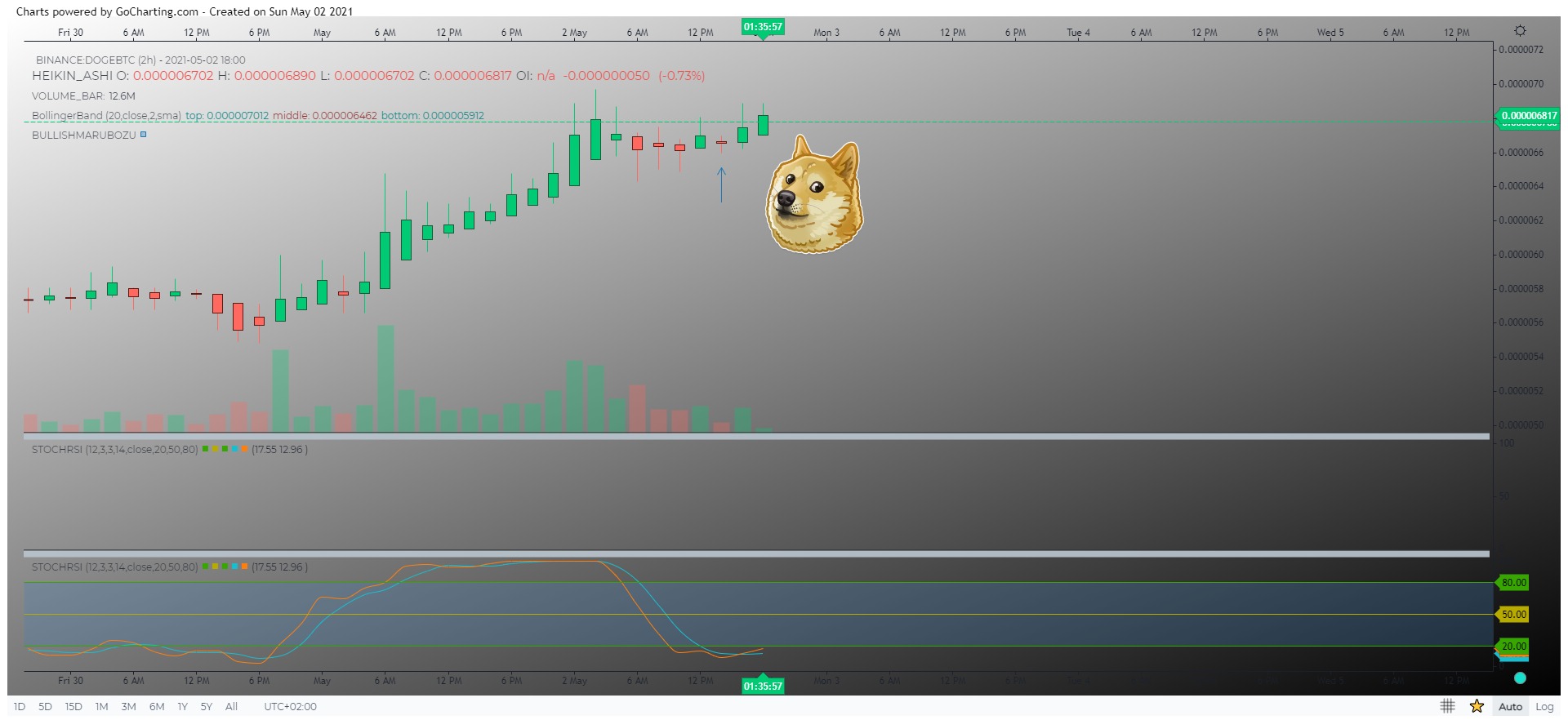 DOGE/BTC ziet er wel positief uit kijkend naar de daily chart/ 2H chart