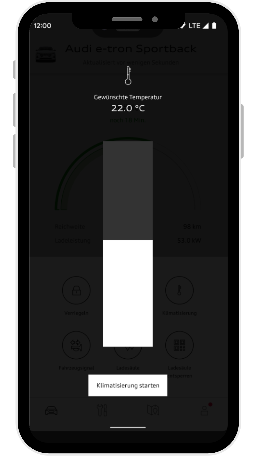 Ik heb een vraagje over de MyAudi app. Als ik de klimaatregeling activeer staat deze standaard op 22 graden ingesteld. Volgens de dealer zou je ook de airco kunnen activeren, maar nu wordt het alleen maar warm in de auto (vanwege de 22 graden). Hoe kan ik de temperatuur instellen in de app? De temperatuur in de auto zelf staat op 20 graden.