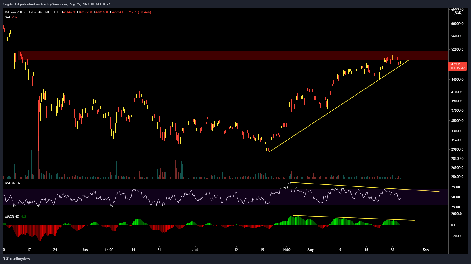 Zo lang als de 47K gehouden wordt er een HL geregistreerd en is er in mijn ogen nog niet veel aan de hand. Verliezen wij de 47k dan zie ik de 44k in bereik. De prijs mag van mij nog even iets verder dippen om de laatste 2 tredes van mijn ladder te hitten, 47k & 46,8.