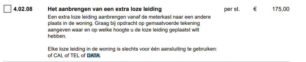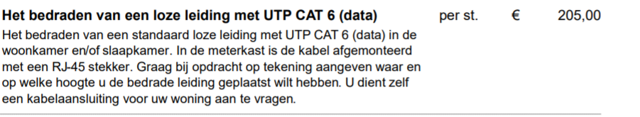 Een loze leiding met blindplaat zat op €150. Daar ik zelf handig ben, heb ik 5 loze leidingen laten leggen naar iedere ruimte in het huis, 100m UTP Cat6 gekocht voor 50 euro, en door iedere loze leiding 1 UTP getrokken en afgemonteerd op een stekker, Keystone en keystone plaat.