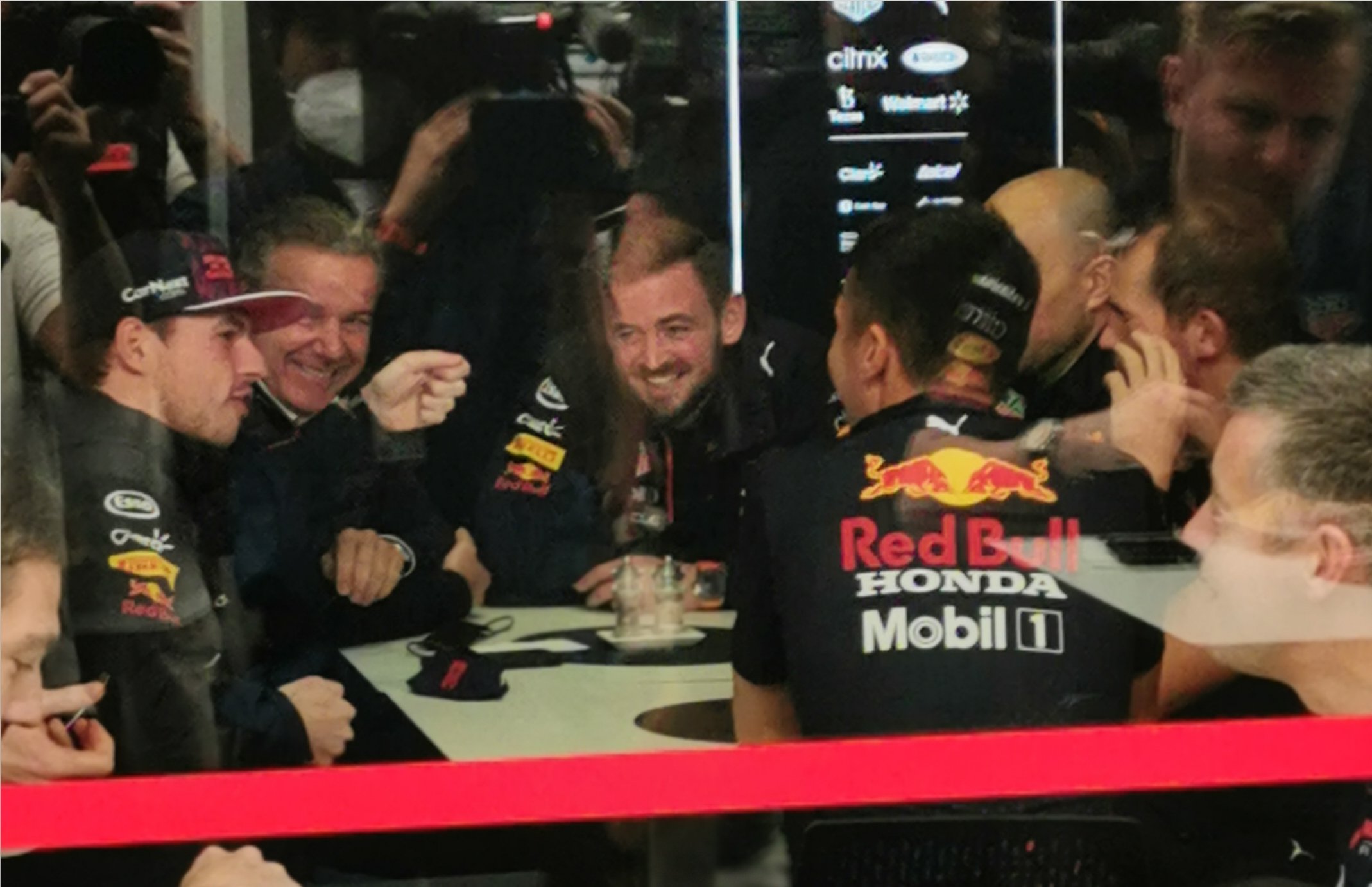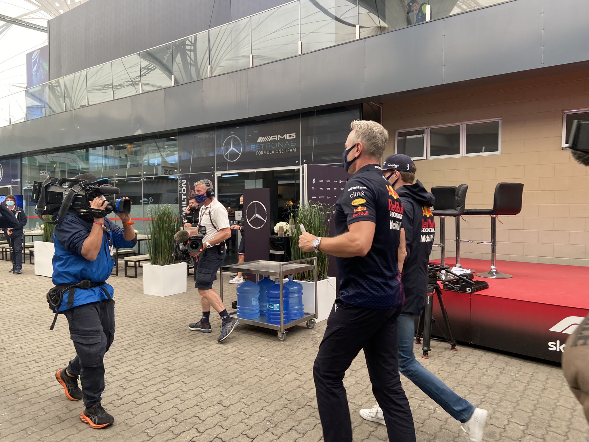 Verstappen op weg naar de stewards, zoals te doen gebruikelijk samen met teammanager Jonathan Wheatley. En onder de nodige belangstelling. #F1 pic.twitter.com/zrBV2P5R2M