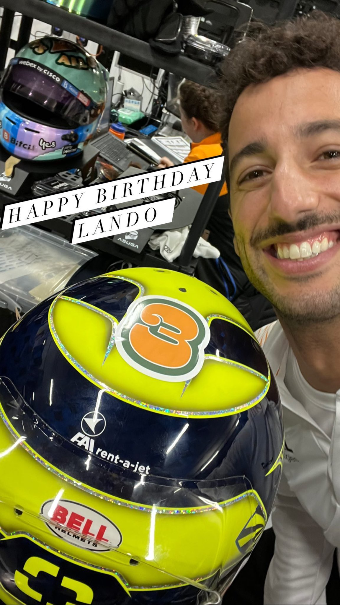 Hij stickert een 3 op de helm van Lando. Die is vandaag jarig. Wat en waarom een 3 weet ik dus niet.