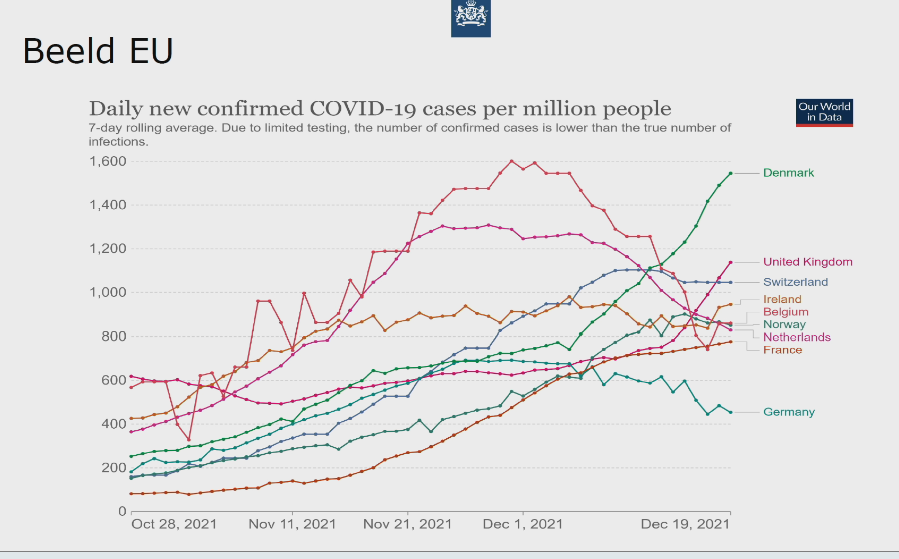 – Percentage opnames in Denemarken (0,5% t.o.v. 1,4%) en het Verenigd Koninkrijk liggen lager bij Omicron dan bij Delta, máár dat komt omdat het het virus nu voornamelijk rondgaat onder jongeren.