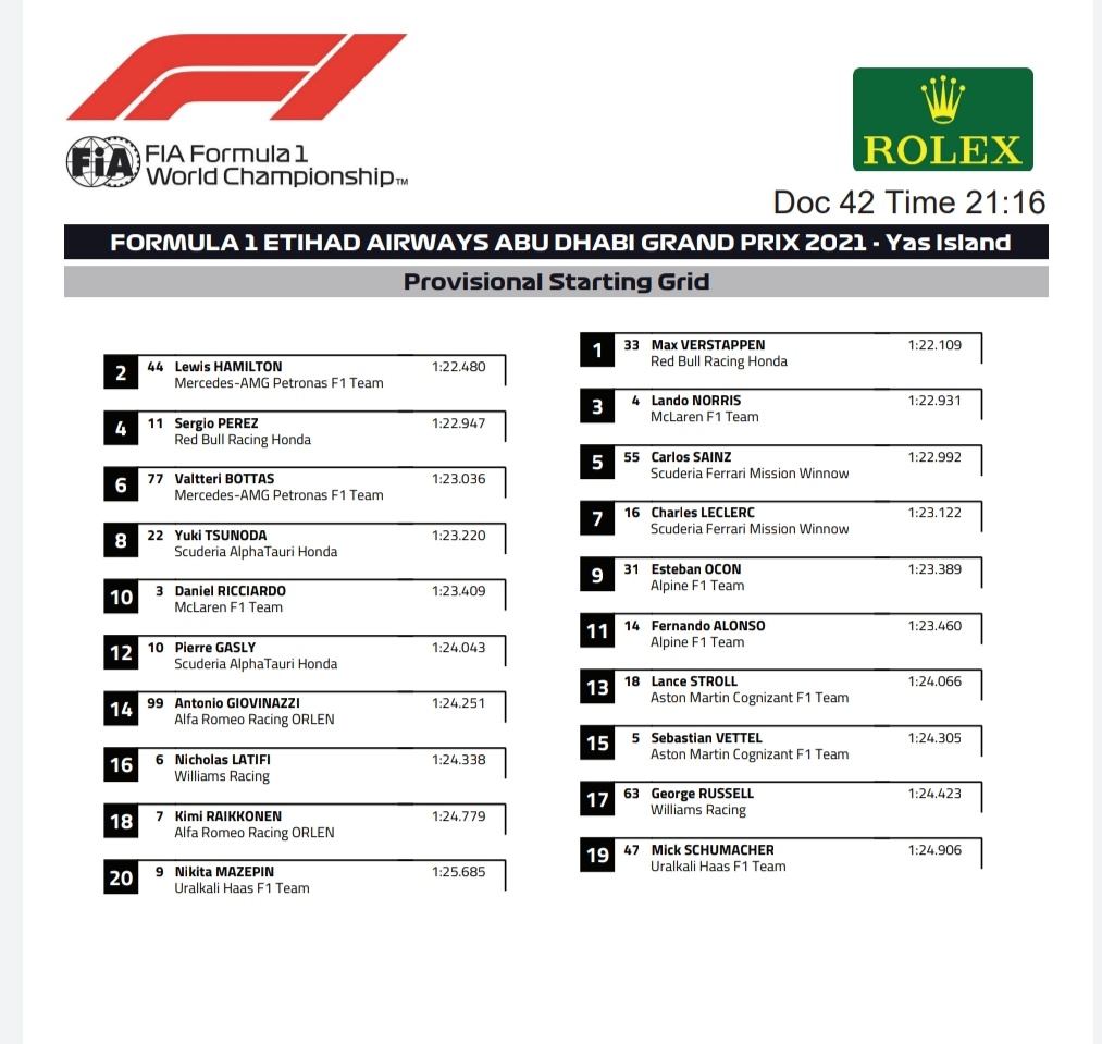 Dat zegt mij dat hij bij de start niet gaat proberen 1 of zelfs 2 plekjes te winnen. Wat best reëel zou kunnen zijn aangezien hij op de rode band staat en HAM op de gele, en hij op het schone gedeelte van de baan en HAM op het vuile.