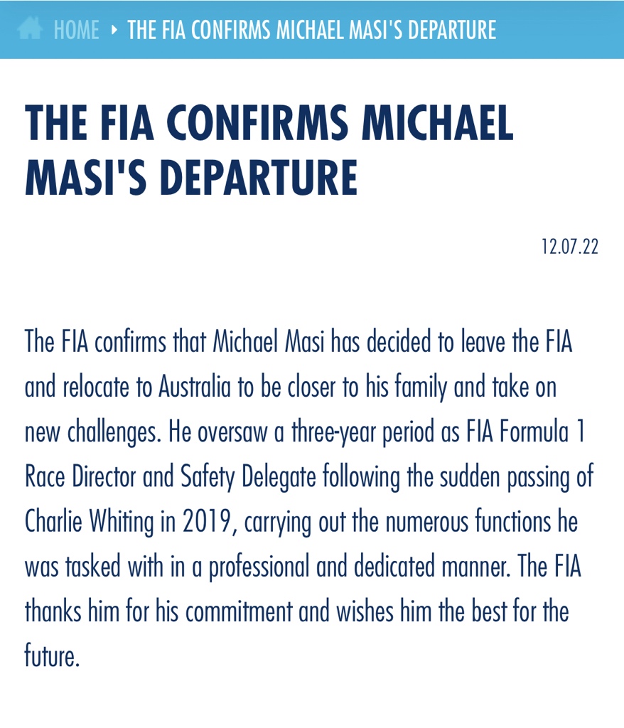Verklaring van Michael Masi over zijn vertrek bij de FIA. Kan zo even niet de verklaring zelf vinden vandaar in quotes.