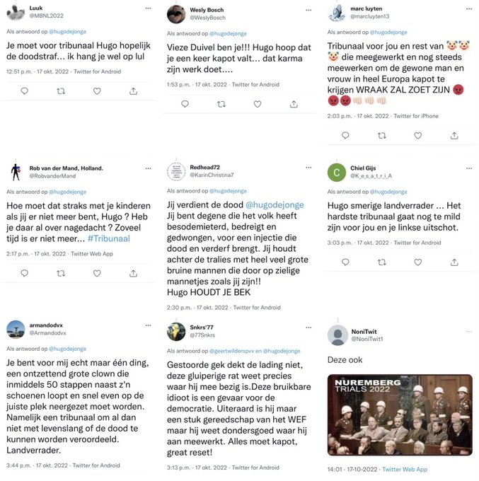 Het vervelende is dat er ook een hoop mensen hem geloven en daar op stemmen. Zo hadden wij laatst een stratenmaker in de straat die fanatiek FVDér was en het had over het mobiliseren van mensen tegen de huidige regering....tja.... zo'n vent is knettergek, maar volgens mij zijn er best een aantal van dat soort dwazen.hoevenpe schreef op maandag 17 oktober 2022 @ 13:35: