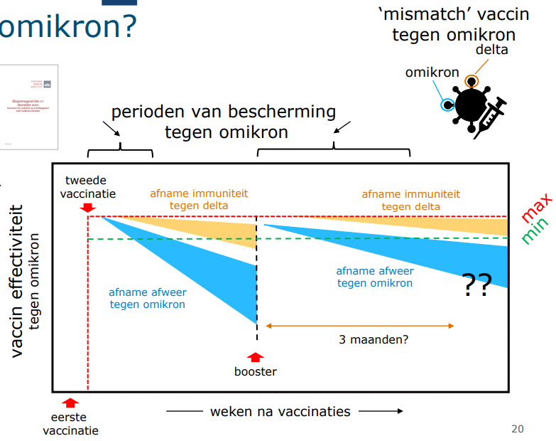 Ook dit is weer kort door de bocht. Ja, het lijkt erop dat de bescherming van de booster sneller afneemt, maar we weten nog weinig over de bescherming tegen ernstige ziekte. We weten ook dat de bescherming bij twee prikken voor ziekenhuisopname nog redelijk op peil bleef, terwijl de bescherming tegen besmetting drastisch terugnam.Wolly schreef op zaterdag 22 januari 2022 @ 15:34: