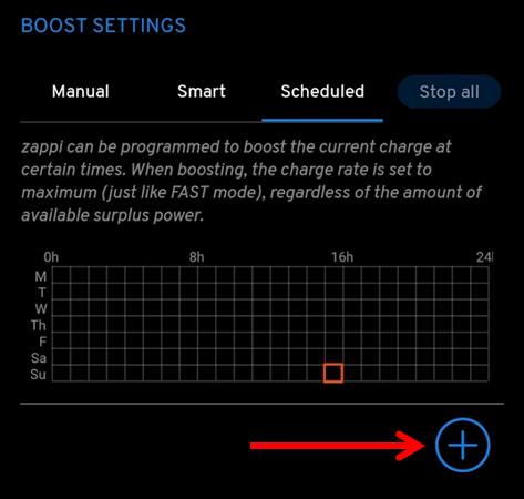 Ik heb de lader ingesteld op Eco+ en een schema ingesteld (schedule). Dat schema heb ik zo gemaakt dat hij dus gaat 'boosten' tussen 23:00 en 07:00 (wanneer het stroomtarief laag is) en in de weekenden. Maar dat heeft nu tot gevolg dat hij buiten die uren geen zak doet, ook niet als ik de 'green' slider helemaal naar beneden trek (1% is het laagst mogelijke). Ik had eigenlijk verwacht, n.a.v. de uitleg op de Zappi site, dat hij dan alleen met 1.4kw zou laden en in de daluren gaat boosten. Maar dat gebeurt dus niet.