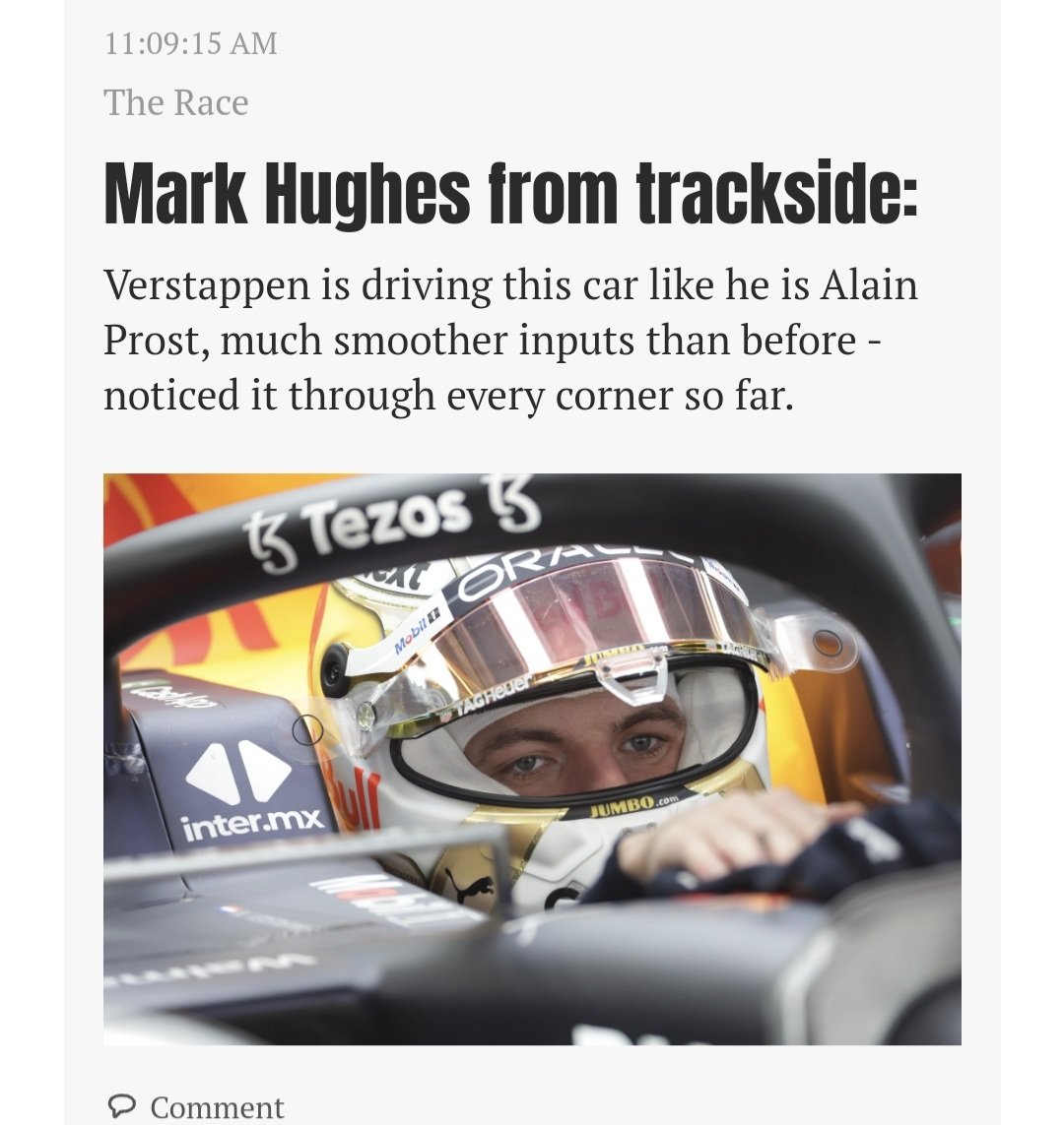 Overigens past VER helemaal niet zijn rijstijl aan... Hij was vorige seizoen ook al een vroeg om de rem om de exit te maximaliseren dus ik weet niet waar die Mark hughes het over heeft.