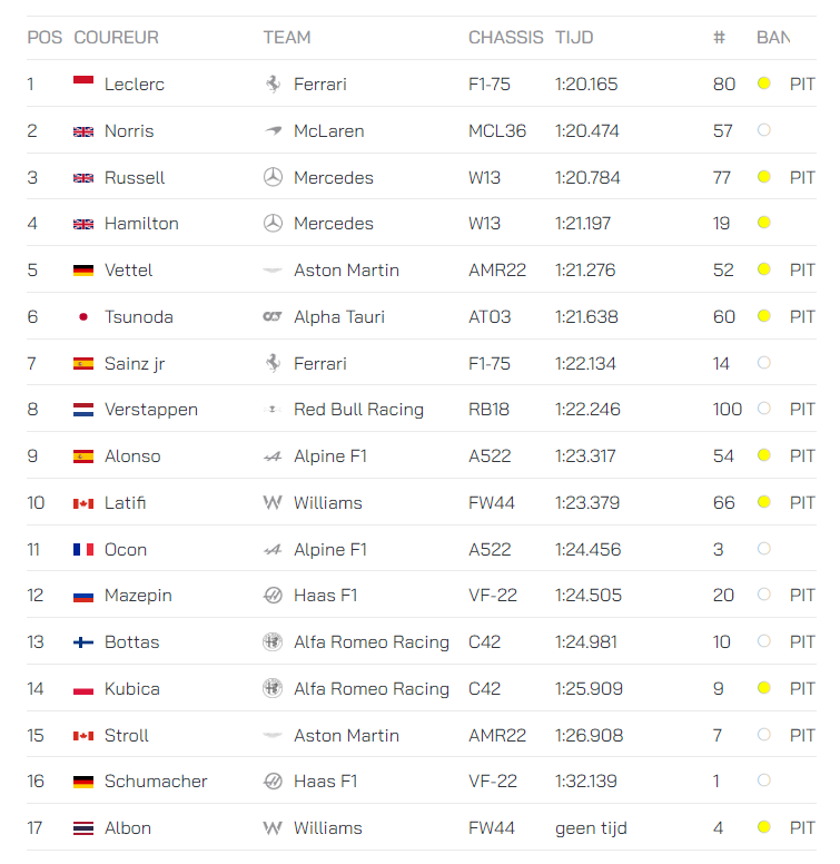 Heeft iemand een goed liveblog waar ook het aantal ronden per coureur op staat? Wellicht ook nog op welke band de snelste tijd is neergezet.