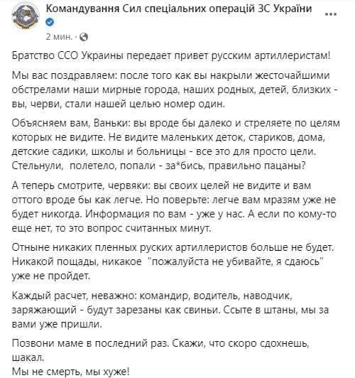 Er lijkt inderdaad bevestiging te zijn, of in ieder geval een waarschuwing te zijn, dat alle Russische artillerie soldaten gedood zullen worden.