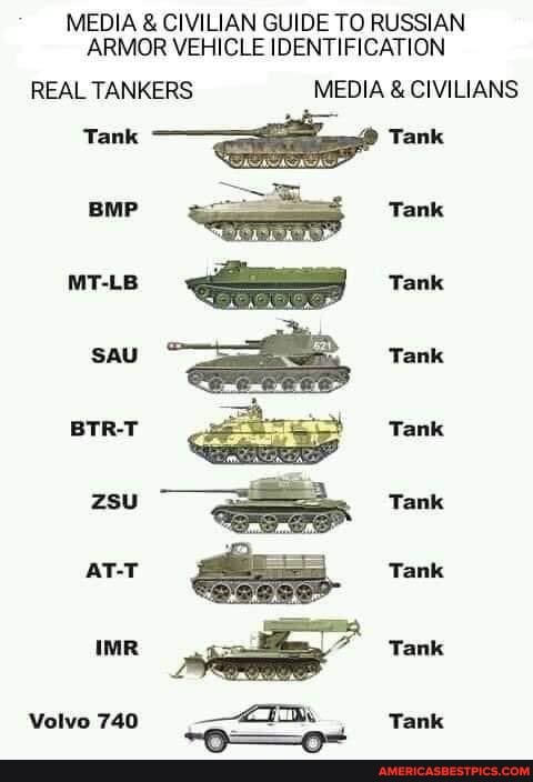 Iemand had een geweldig plaatje gepost van allerlei voertuigen en hoe militairen ze noemen vs hoe journalisten/gewone mensen ze noemen, links de echte naam en rechts bij alles tank, grapje de laatste was en volvo 740. Ik kan hem niet vinden, maar wilde hem ff aan familie laten zien want net keken we en het is inderdaad duidelijk dat alles met een zwaar wapen erop snel als tank overkomt terwijl ze dit niet zijn, iemand weet welk plaatje ik bedoel?