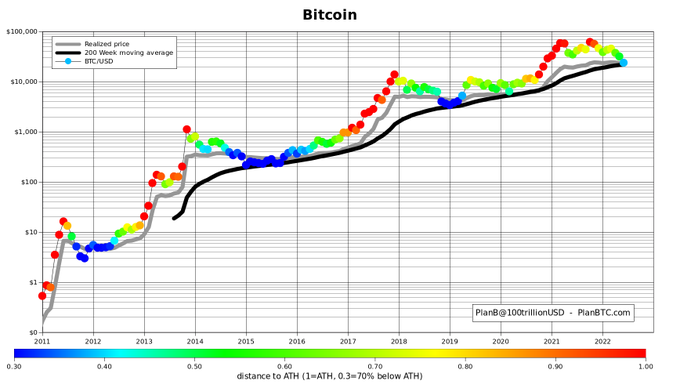 Some are waiting for dark blue. But it's possible that we will not have dark blue this time. Dark blue = 70% below monthly ATH = 0.3*61K = 18K. Problem: 18K is below 200WMA (22K), that never happened before. Or we have dark blue and break 200WMA, or 200WMA holds and no dark blue! pic.twitter.com/7lxexzWtdr