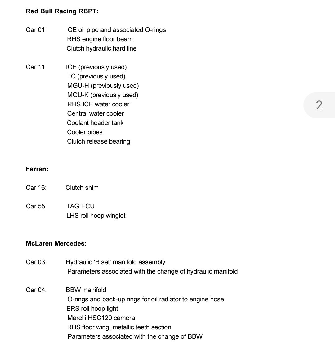 Hier een overzicht van alle vervangen onderdelen onder parc ferme. Thanks Scarbs.