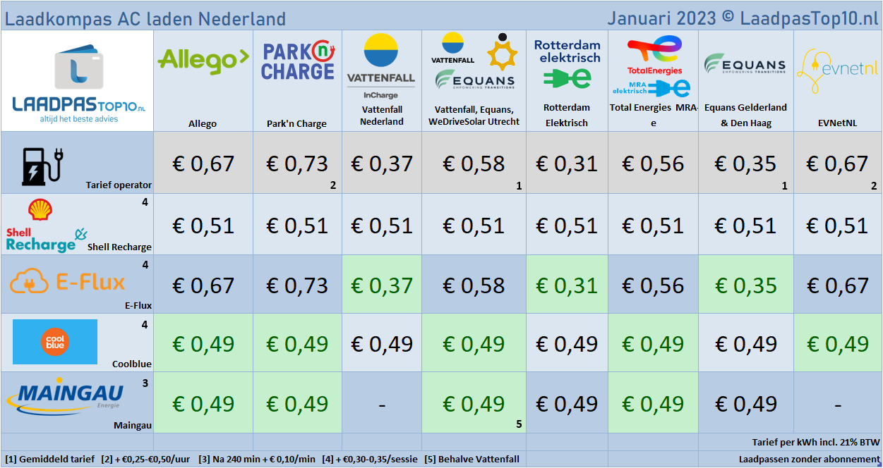 Shell, Eneco, ANWB, Coolblue en nog een paar kleintjes. In Duitsland heeft bijna elke laadpas een vast AC tarief maar ook extra voorwaarden zoals 50% in DE laden. Maingau is een van de weinige uitzonderingen.