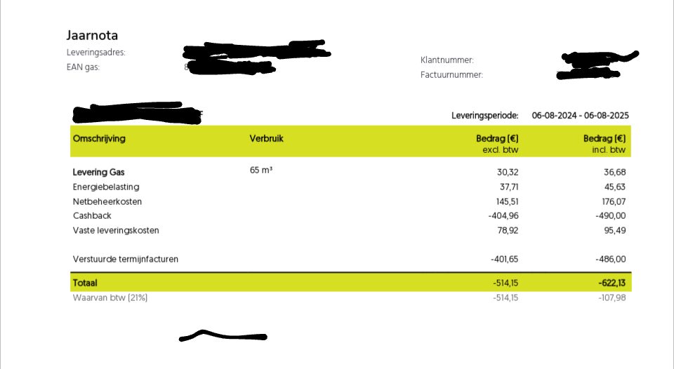 Ik heb nu op €100 per maand voor gas en stroom met straks een cashback van €350 in oktober 2025.