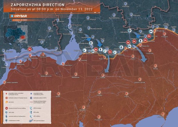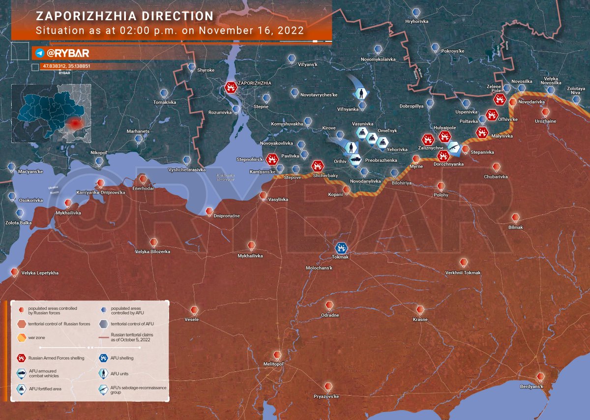 Het Zaporizhzhia front bevind zich in in het zuiden van Oekraïne. Het gaat hier om vrijwel de gehele Zaporizhzhia oblast alsmede de Cherson oblast ten oosten van de Dnipro. Dit deel van het front is al maanden vrij statisch geweest omdat beide strijdende partijen, andere prioriteiten kenden. Belangrijkste gebeurtenissen hier zijn de beschietingen van de kerncentrale in de regio. Verder naar het zuiden ligt de al langer bezette Krim.