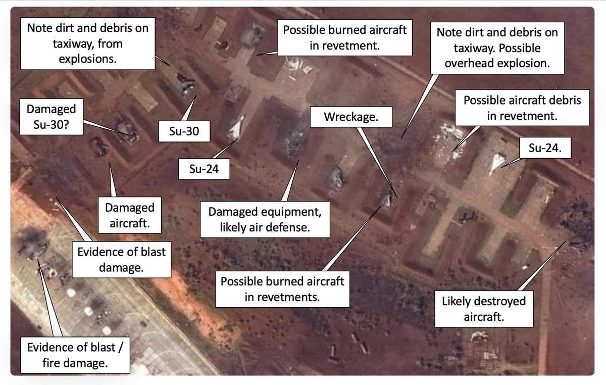 BELBEK STRIKE /PRELIMINARY/ Overhead imagery reveals blast and fire effected multiple aircraft at the Russian Naval Air Station at Belbek in occupied Crimea. Damage to Su-30 and Su-24 strike fighters is evident, as well as damage to at least two other aircraft, type… pic.twitter.com/Mp7uq8fB9I
