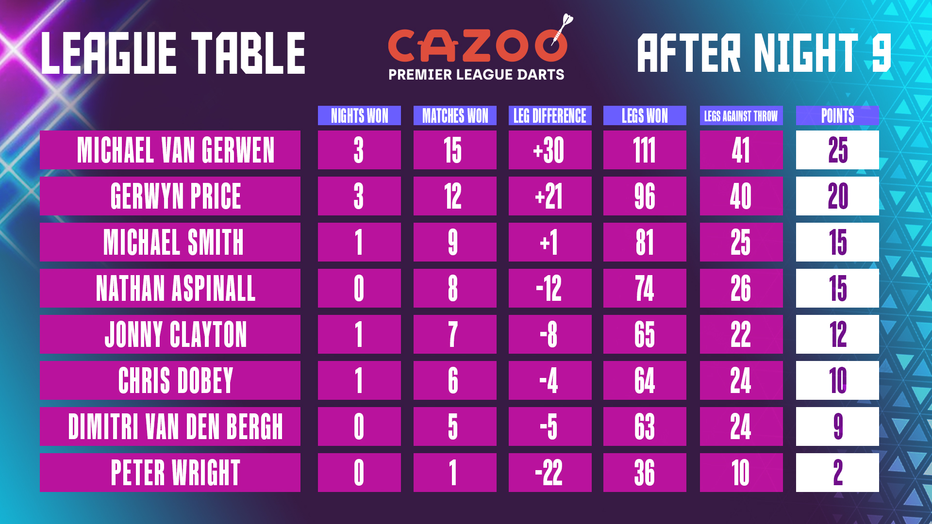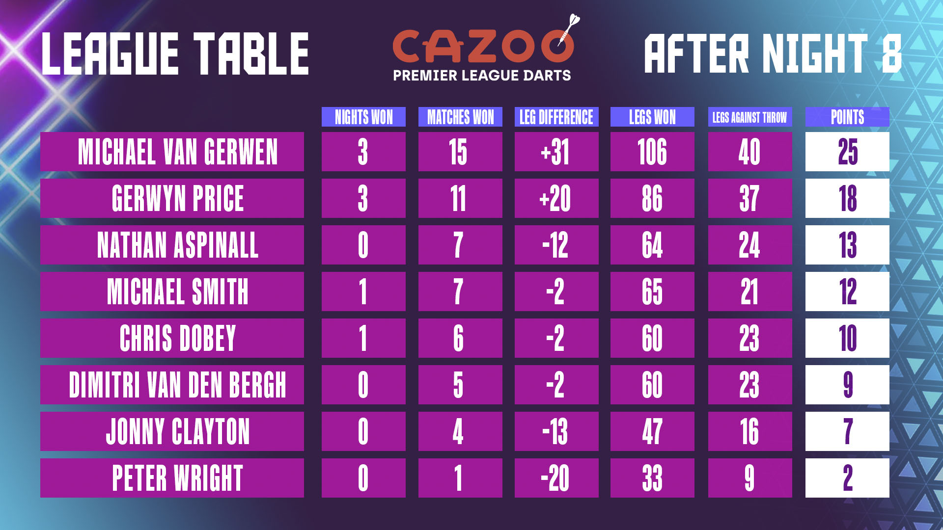 Dan is deze winst voor Clayton best belangrijk. Lekker dat van Gerwen in de Premier League wel redelijk stabiel presteert.