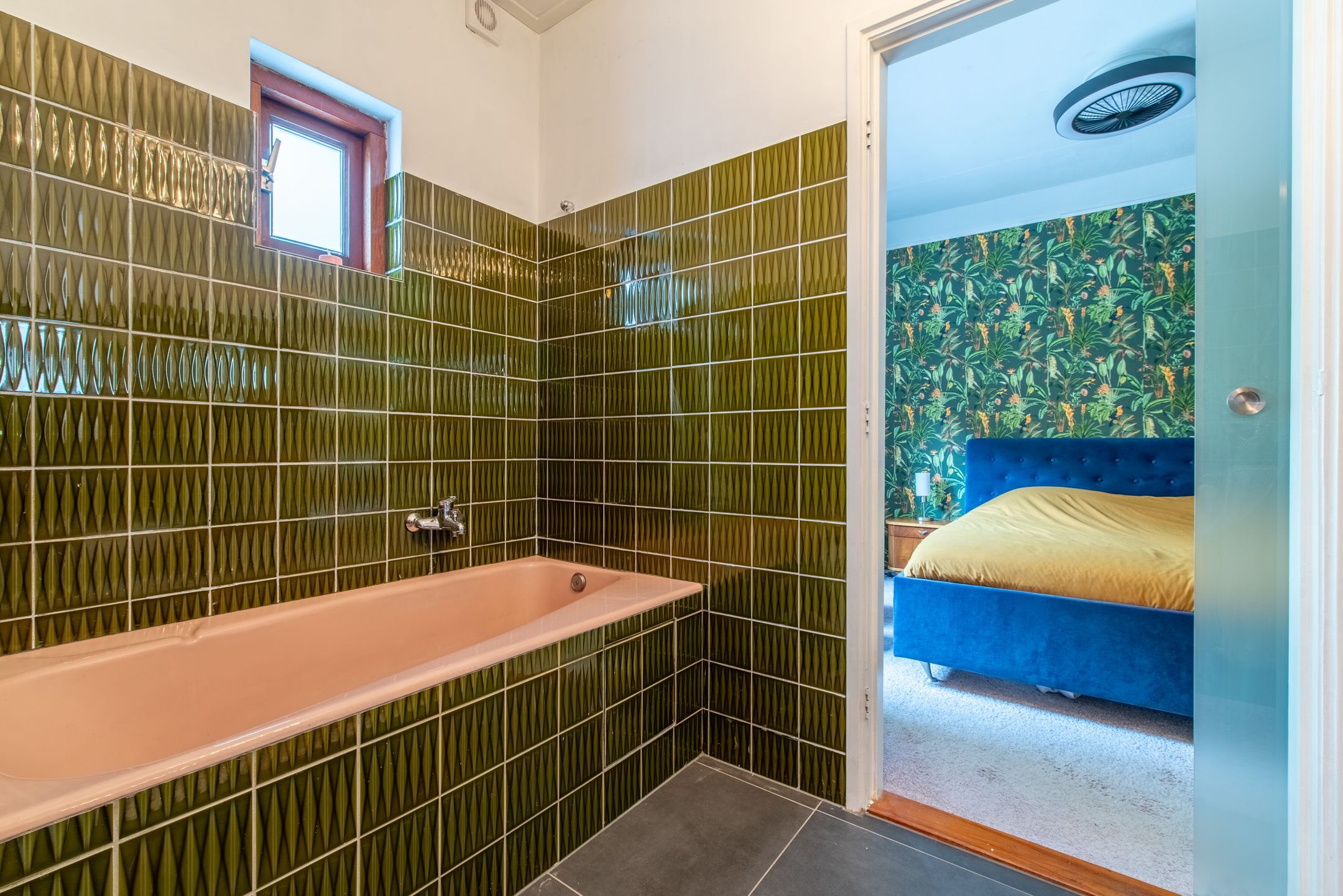 En van een roze-groene badkamer.