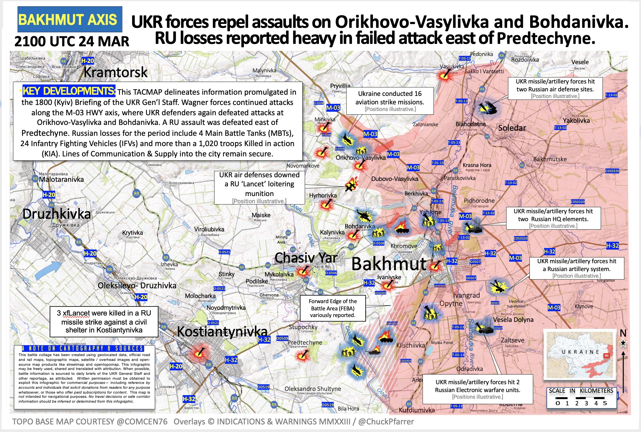 De huurlingen van Wagner hebben aanzienlijk aan kracht ingeboet en zijn stilaan buiten adem”, zei kolonel-generaal Oleksandr Syrskyi. “Heel binnenkort zullen we gebruikmaken van deze opportuniteit, zoals we dat deden in Kyiv, Charkov, Balaklija en Koepjansk.” Daarmee verwees hij naar vorige succesvolle tegenoffensieven waarvan hij zelf de architect was. Het momentum in Bachmoet is volgens hem hetzelfde als toen. De vijand is uitgeput, de logistiek achter de frontlinie verstoord en het Oekraïense leger is gehergroepeerd.