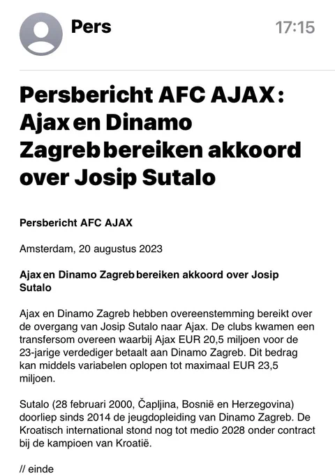 Serieus? Gisteren nog een bericht dat ie 6m moet kosten. Over geld weggooien gesproken...donleone83 schreef op maandag 21 augustus 2023 @ 09:03: