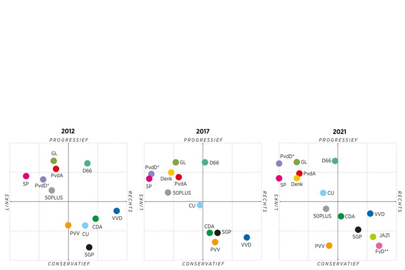 En kijk je naar het verloop over tijd dan is D66 juist steeds meer naar links getrokken, i.p.v. andersom. [2]