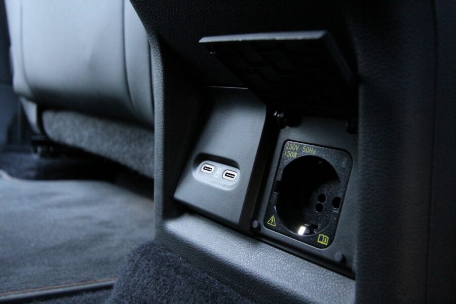 zoals @rft80 zegt: middenconsole achterin. Is een gewoon stopcontact. Er zitten daar ook USB-C poorten maar ik weet niet hoeveel W die zijn.