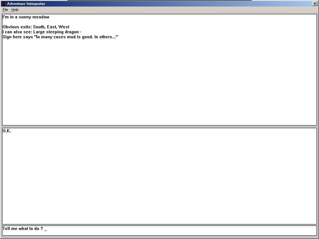 ..en verder niks. Dan is het de bedoeling dat je gaat 'praten' met de computer. Dus je typt iets als 'trek je jas uit' en vervolgens krijg je te horen 'dit lijkt me niet nodig'.