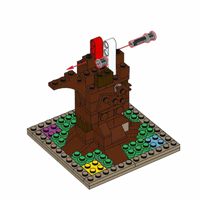 En als je die bruine 1x1 brick met technic hole eraf haalt, en probeert die pin door het bovenste rode gat en dan dat blokje te duwen? Gaat dat wel?