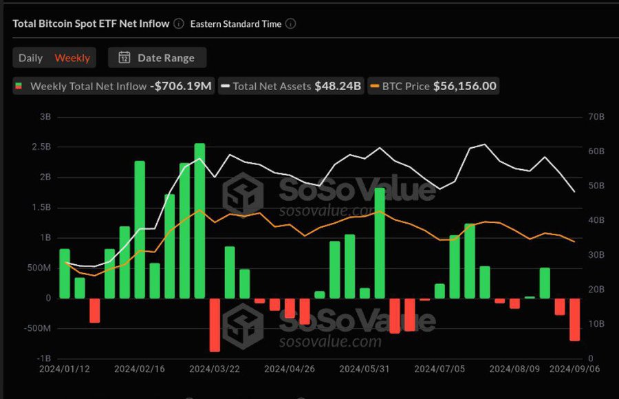 #Bitcoin spot ETFs took a hit last week, bleeding $706.19 million in total outflows.