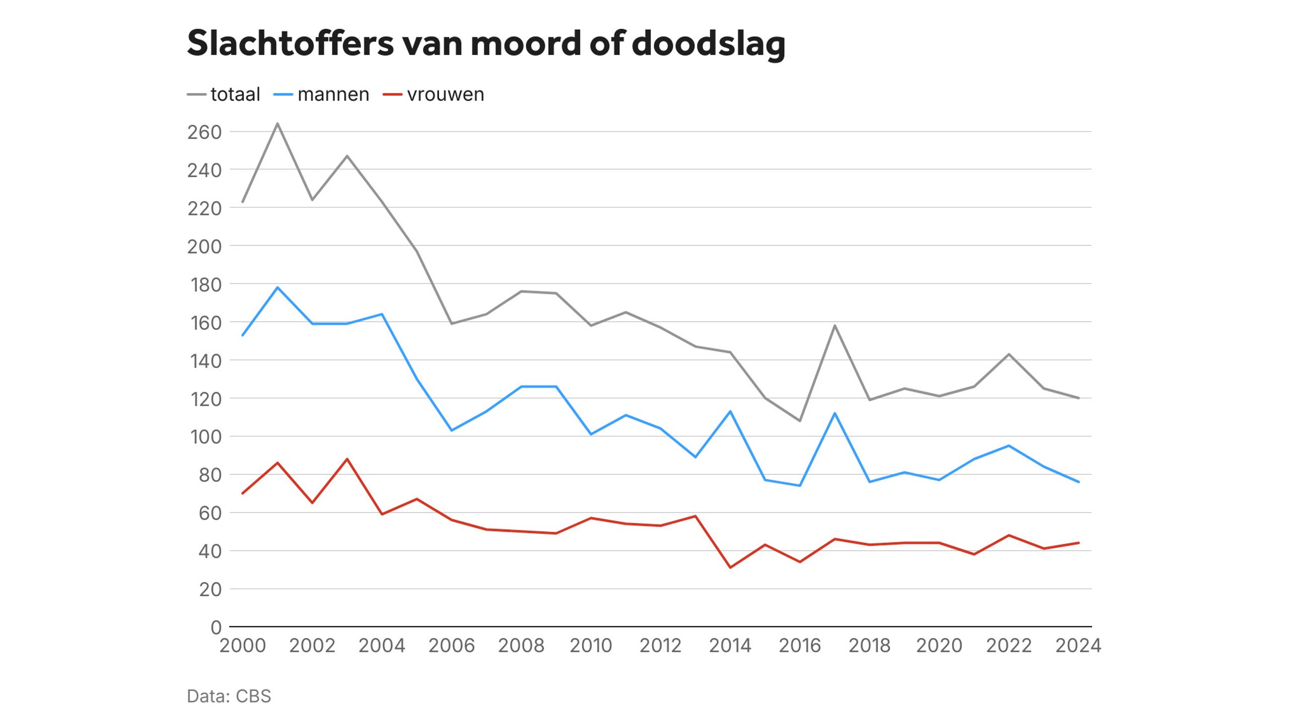 We zitten dus al een decennium rond de 120 moorden per jaar. Voor vrouwen net over de 40 per jaar, waarvan de helft door hun partner of ex partner vermoord zijn en nog eens 20% door een naaste familielid. Dus 70% van de moorden, zo tegen de 30, gebeuren dus door partners of naasten. Veel vrouwen worden ook thuis vermoord en juist weinig op straat.