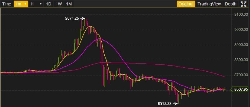 Op 30-5-2019 steeg Bitcoin binnen 15 minuten van 8.725 USDT naar 9.074 USDT, om daarna in 10 minuten naar 8.625 USDT te dalen. Enkele minuten later werd zelfs nog 8.513 USDT aangetikt. Juich dus niet te vroeg en blijf altijd alert!