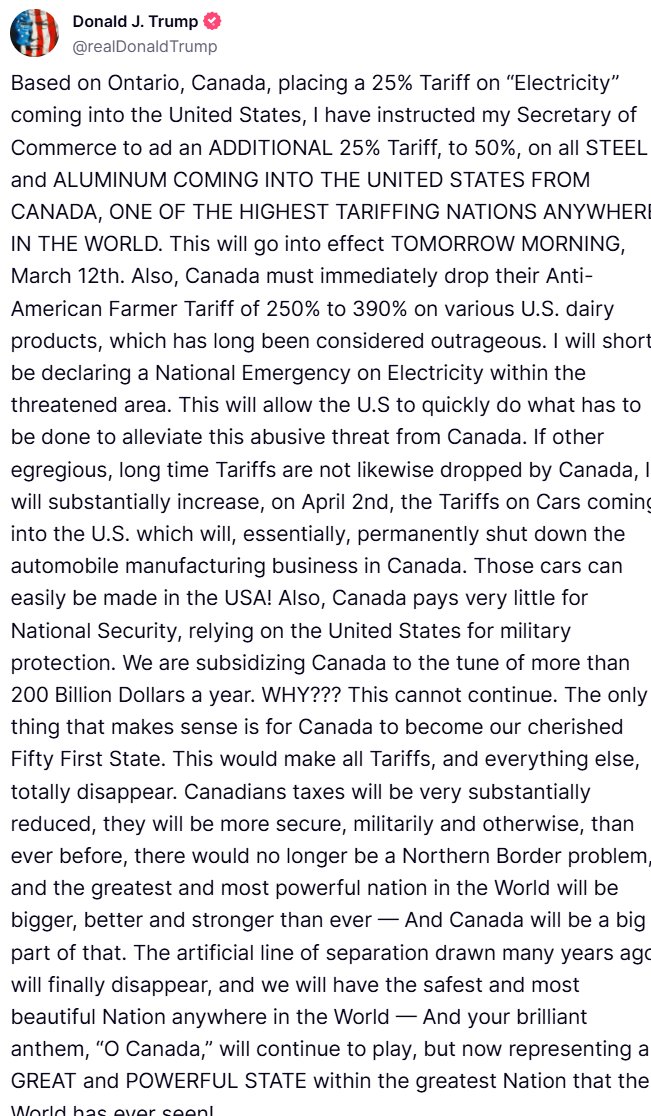 JUST IN: 🇺🇸🇨🇦 President Trump says all tariffs on Canada will "disappear" if they become our 51st state.