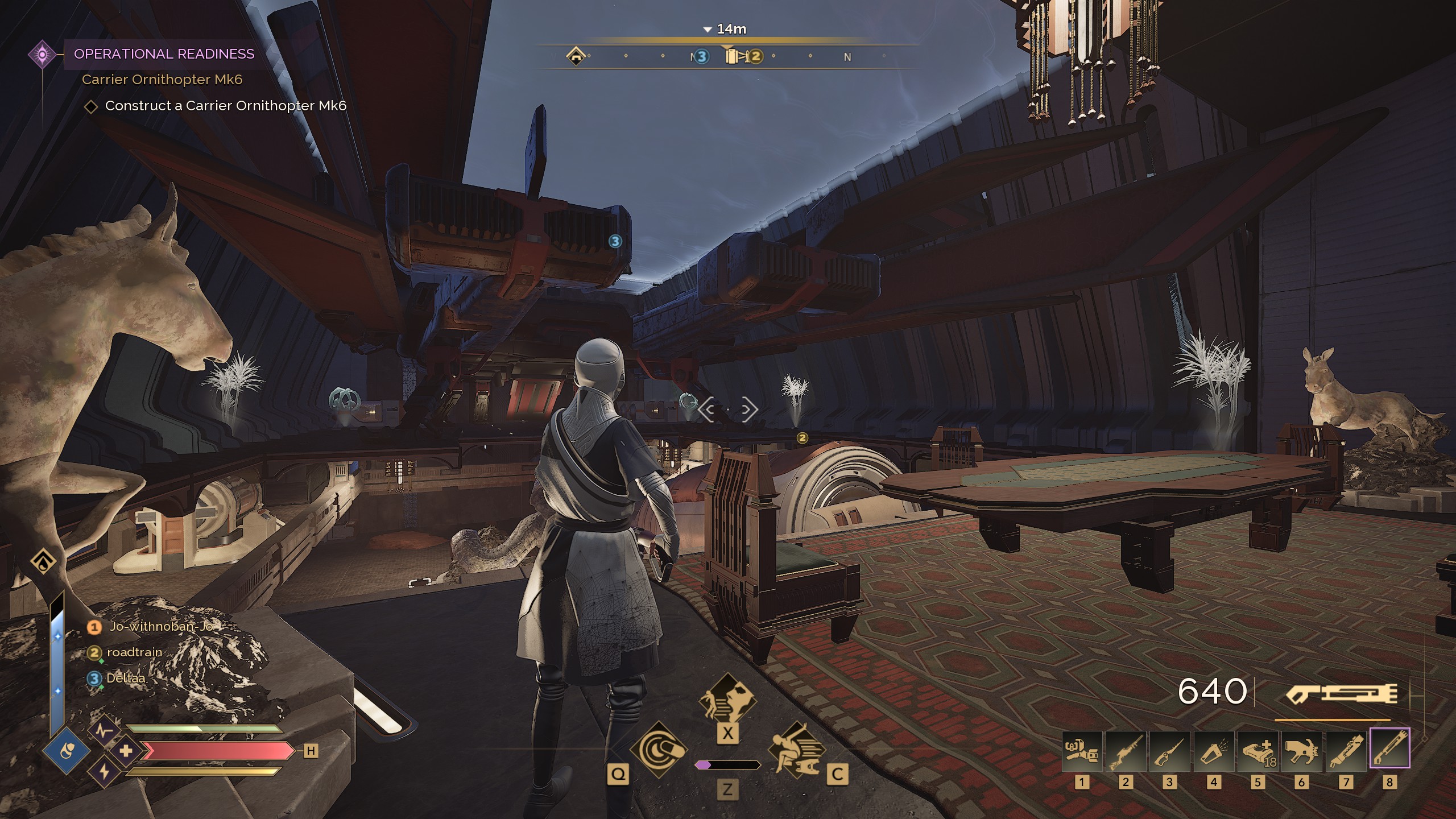 En als ik denk dat het veilig is, pak ik de snelste scout Ornithopter die ik heb en vlieg ik het PvP deel in op zoek naar neergestorte wrakken voor extra blueprints. Riskant klusje maar levert wel leuke buit op, voor jezelf of om te verhandelen.