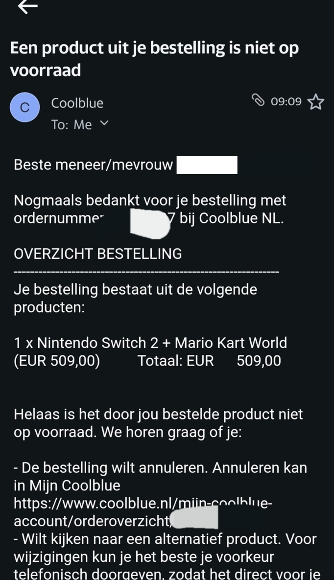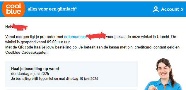 Ik heb overigens gister een setje joy-con besteld om af te halen in hetzelfde Coolblue filiaal. De bevestigingsmail die ik daarvoor heb gehad is identiek aan de mail mbt de Switch 2 die ik 18 april heb.