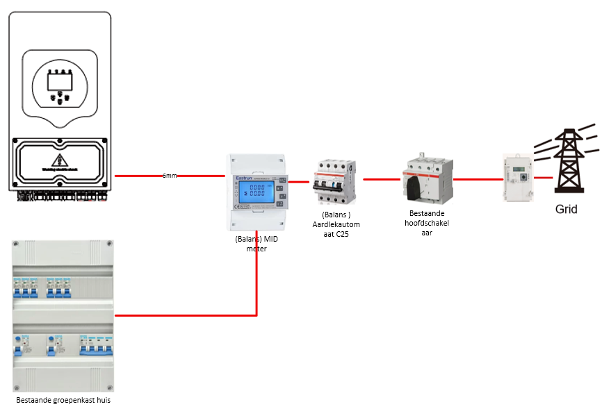 Zit het dan zo voor de versie zonder offgrid?Zonder offgrid komt de MID-meter in de meterkast, samen met een C25 300mA aardlekautomaat (of een losse aardlekschakelaar en installatieautomaat)