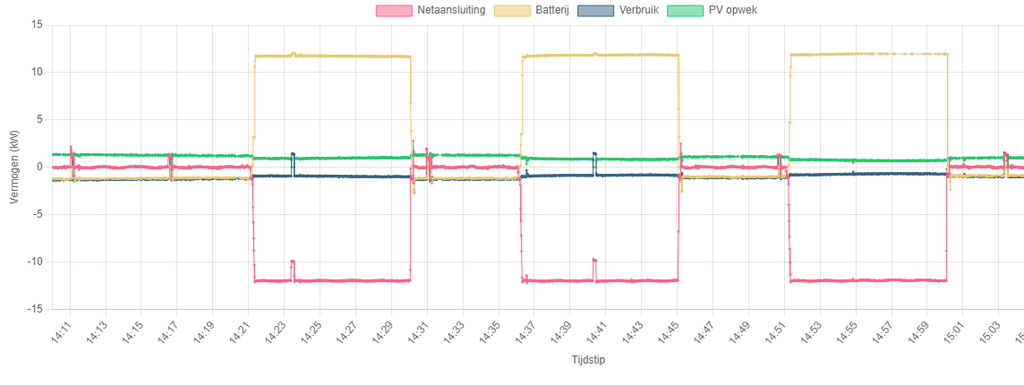 Nee geen 4KW PV productie (om 20.30 ‘s avonds 😉) maar er ging 4KW de batterij uit (huisgebruik) Als daarna een import activatie komt dan zal de batterij met max 12KW gaan laden + de 4 KW huis gebruik direct uit het net komen. Blijkbaar steeg het huis gebruik nog even kort tijdens de actievatie en krijg je dus een piekje (van een seconde) op 18KW, de deye zal dan het laad vermogen wat terug schroevenGet!em schreef op dinsdag 24 maart 2026 @ 20:59: