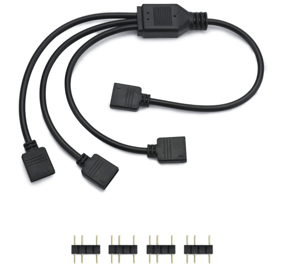 Ik vond een kabel (QWORK® ARGB-splitterkabel, 5 V, 3-pins, argb-splitter, 1 bus naar 3 stekkers) waarmee ik dacht dat ik het wel voor elkaar zou krijgen. Deze is vandaag binnen gekomen en heb ik aangesloten, met de extra stekkers, op de stekkers van de NZXT fans. De kabel heb ik dan weer aangesloten op nog een 'addressable Gen 2 header', daar heb ik er 3 stuks van. Echter heb ik dus geen RGB. De kabel wordt gelever met een paar extra stekkertjes die ik tussen de aansluiting van de NZXT fans en de kabel heb geprikt. De gemarkeerde draad van de stekkers (NZXT) zitten op de pijltjes van de stekker van de splitterkabel.