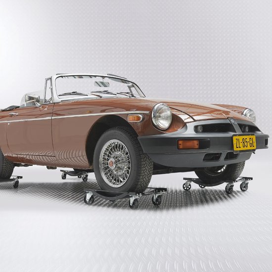 Met een krik en (wiel)dolly's de auto verplaatsen.