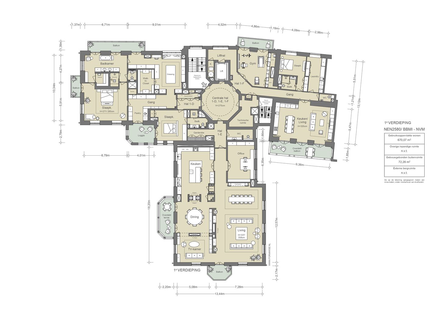 Daarnaast een tweede woonkeuken, kantoor. gym, wasruimte, drie slaapkamers met elk een eigen badkamer waarvan de hoofdslaapkamer ook beschikt over een inloopkast en sauna. In totaal zijn er zeven balkons met onder andere uitzicht op het Vondelpark.