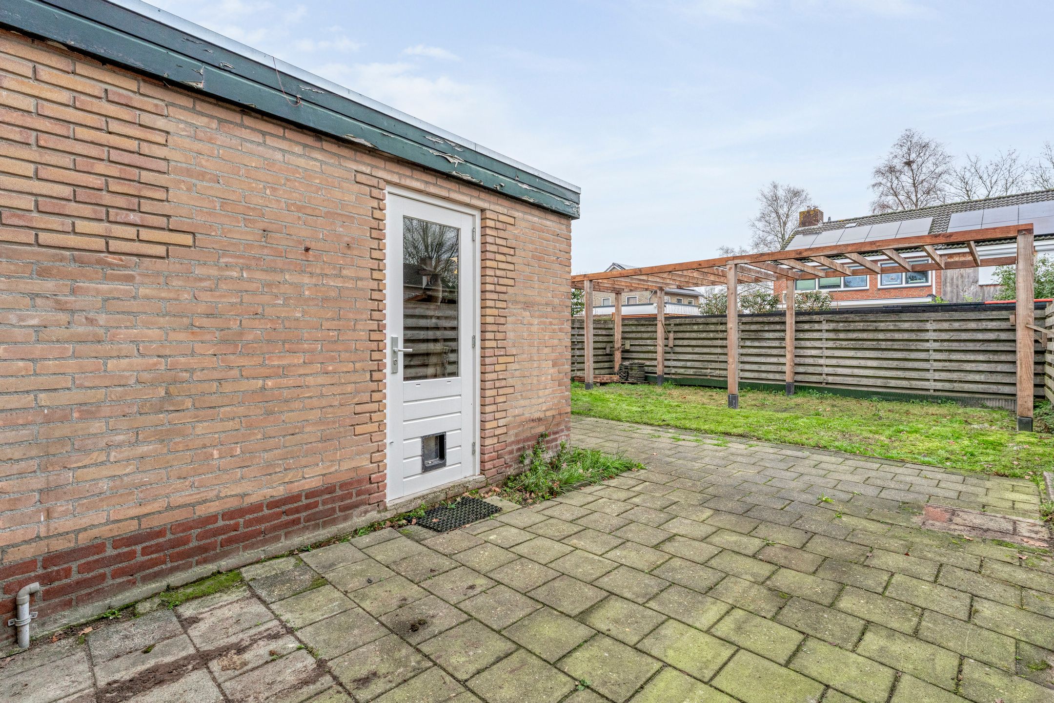Zo je krijgt wel een vreemde situatie zeg als je besluit de garage/magazijn niet mee te kopen bij die woning. Ook fijn als iemand anders het magazijn koopt, kijken ze mooi je tuin in met die raampje.Garage en ruimte voor een auto op de oprit indien het magazijn mee wordt gekocht. Verder is het op straat voor de deur parkeren.